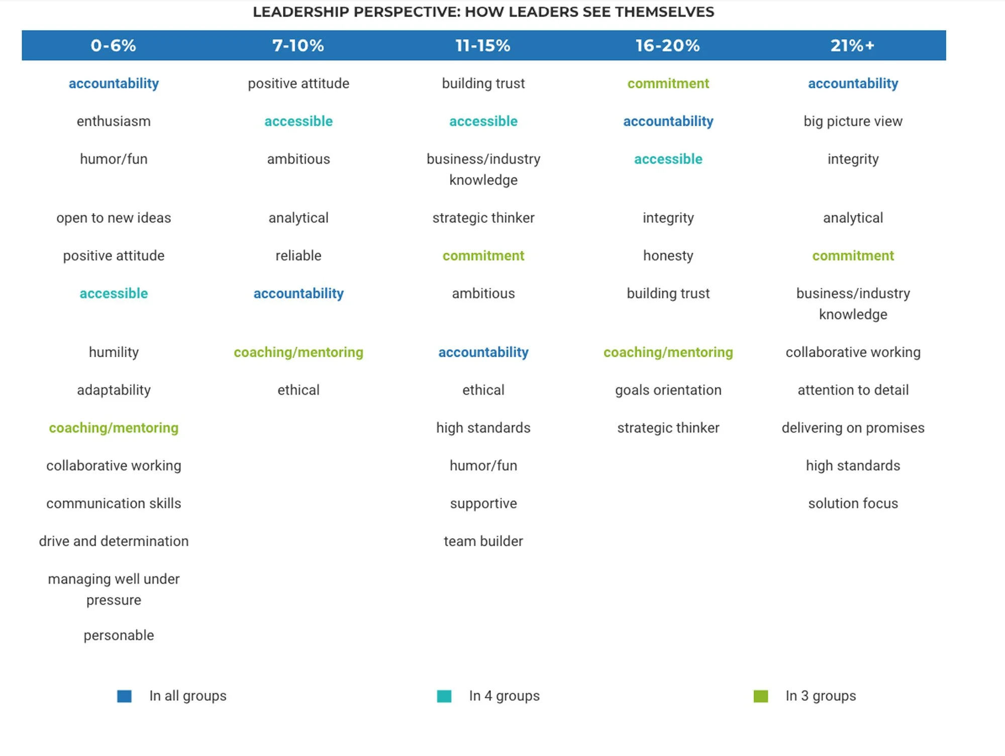 A high number of matches shows that the leader is coming across effectively, authentically, and able to walk his/her talk.