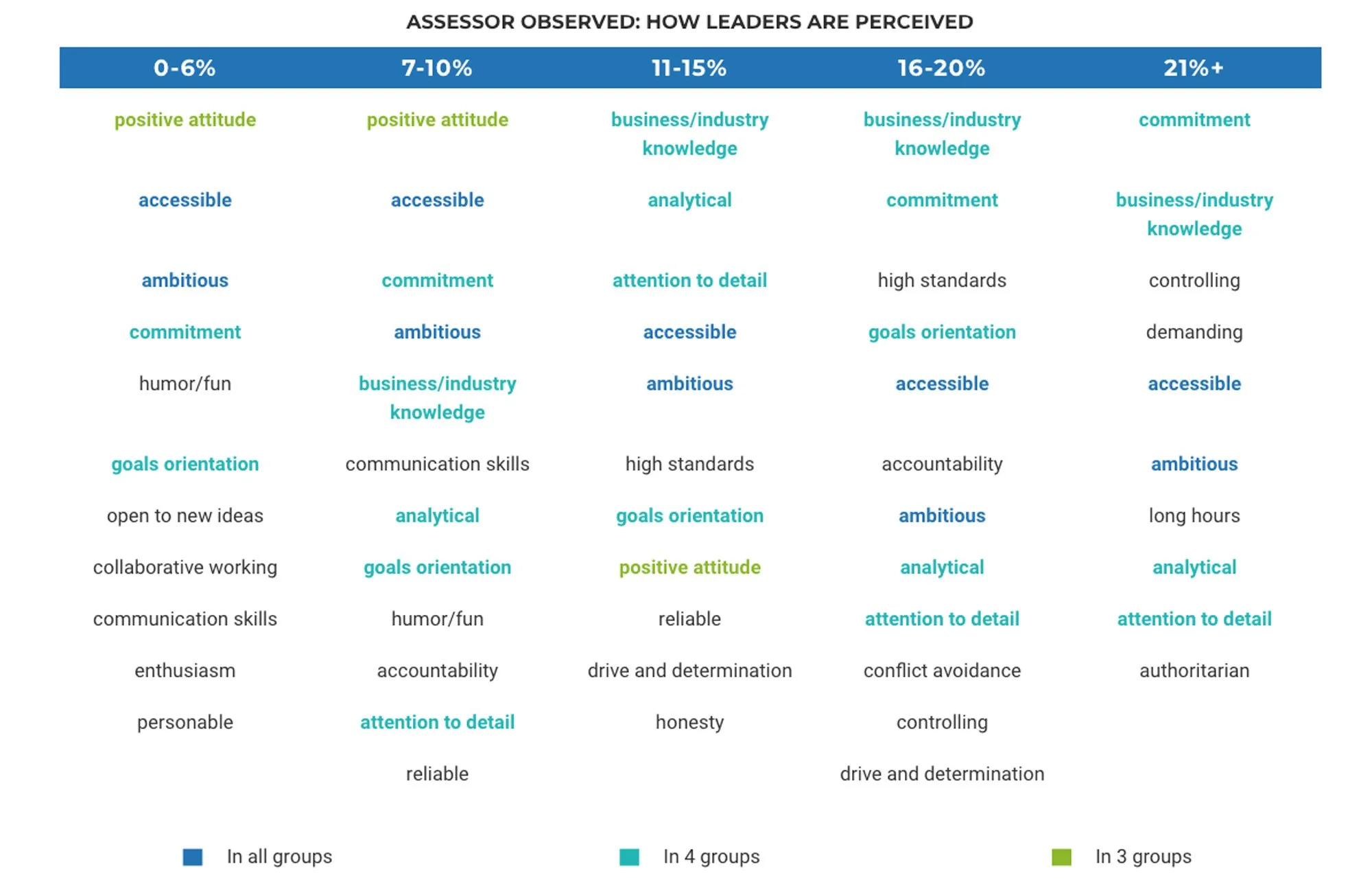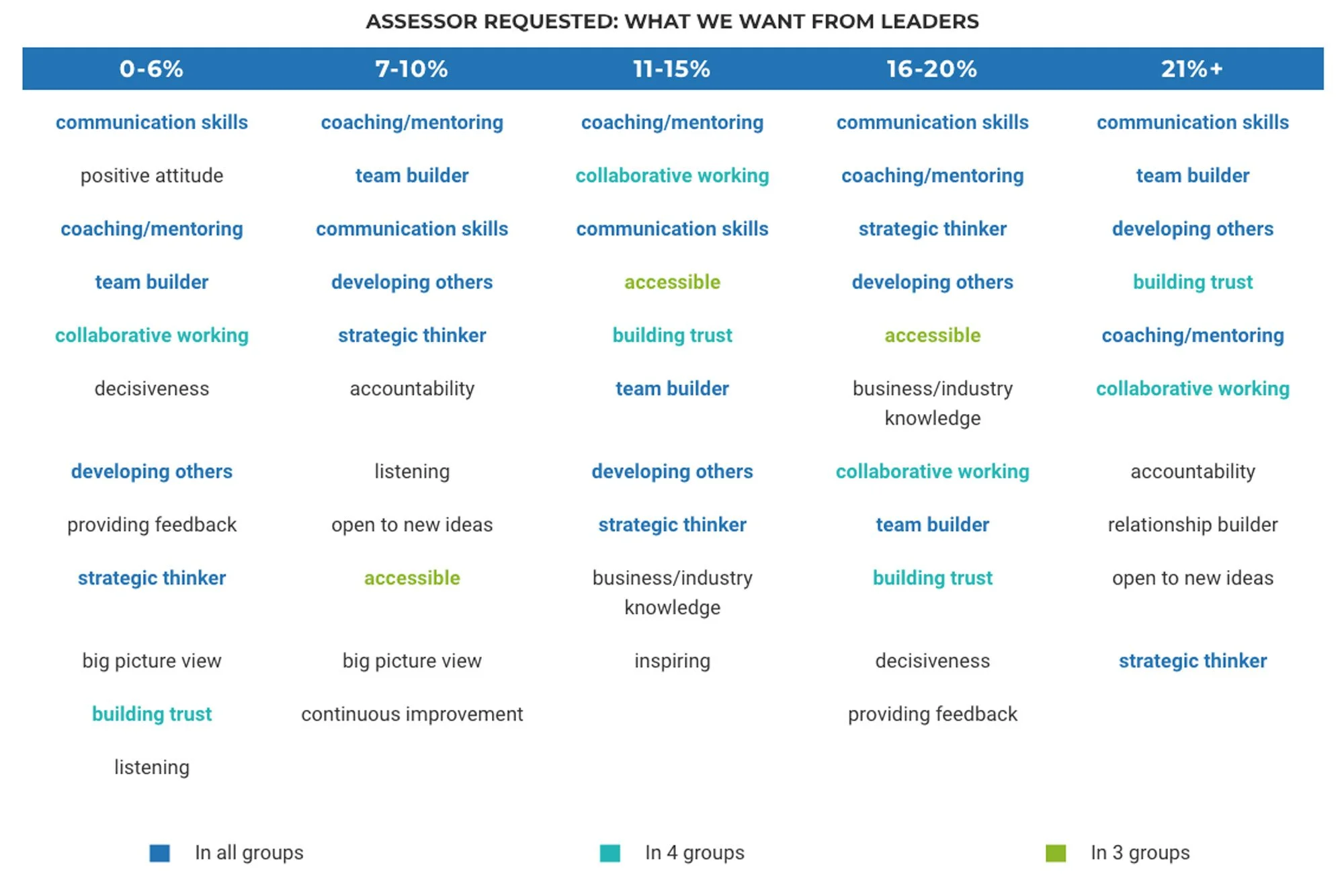 The top area of focus across all groups is at Level 4 – Facilitator/Innovator, indicating that leaders need to pay attention to the development of new ideas and learning, enabling others to express themselves and take more accountability. Additionally, assessors across all groups want leaders to increase their role as a Mentor/Partner, with more focus requested at Level 6. This is a call for leaders to make a difference in the world, to help employees realize their potential and collaborate more, both internally and externally.