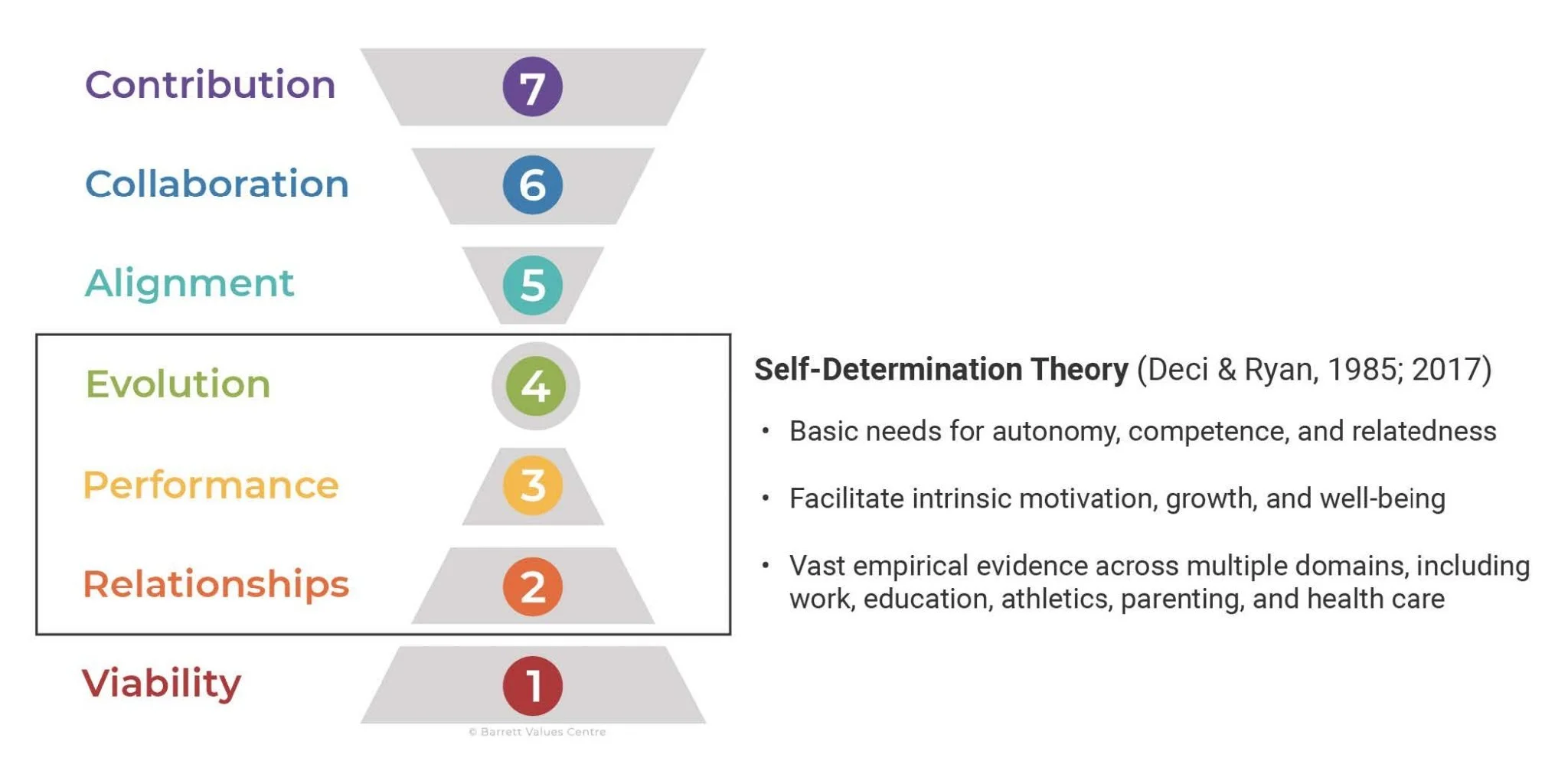 The three needs of SDT are similar to the foundational needs located in the lower and middle portions of the Barrett Model, namely the Relationship, Performance, and Evolution levels. The Barrett Model concurs with SDT and the assertion that optimal human functioning is first established by forming secure relationships with others, demonstrating capabilities, and gaining autonomy for one’s decisions.
