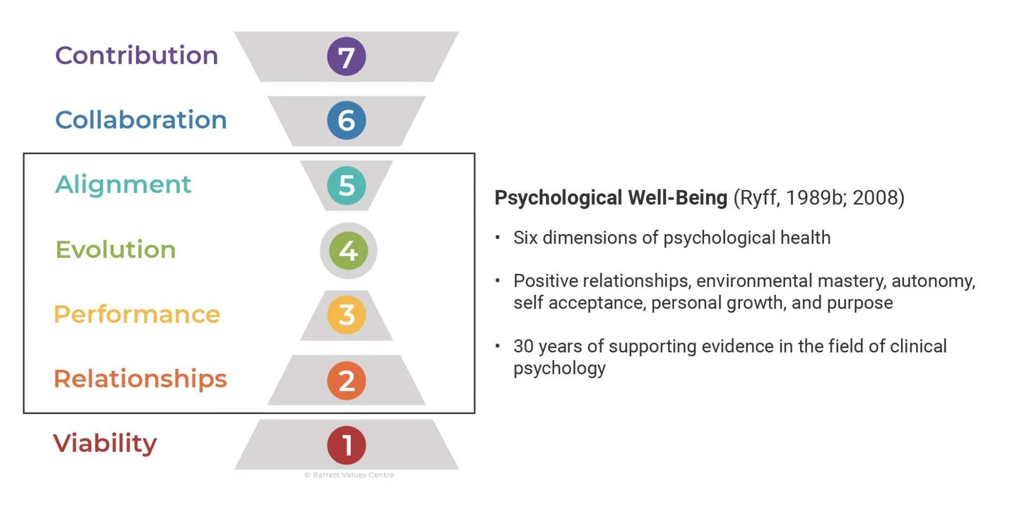 There is incredible consistency between PWB and the seven levels of human needs in the Barrett Model. Both models address the importance of Relationships and competent Performance (called “environmental mastery” in Ryff’s model). The Evolution level of the Barrett Model incorporates Ryff’s autonomy, self-acceptance, and personal growth dimensions. Ryff’s “purpose in life” dimension is similar to, but not as fully articulated as the Barrett Model’s levels for facilitating a sense of purpose, which are Alignment (or authentic self-expression), Collaboration (or interconnection), and Contribution.PSYCHOLOGICAL WELL-BEING (PWB)