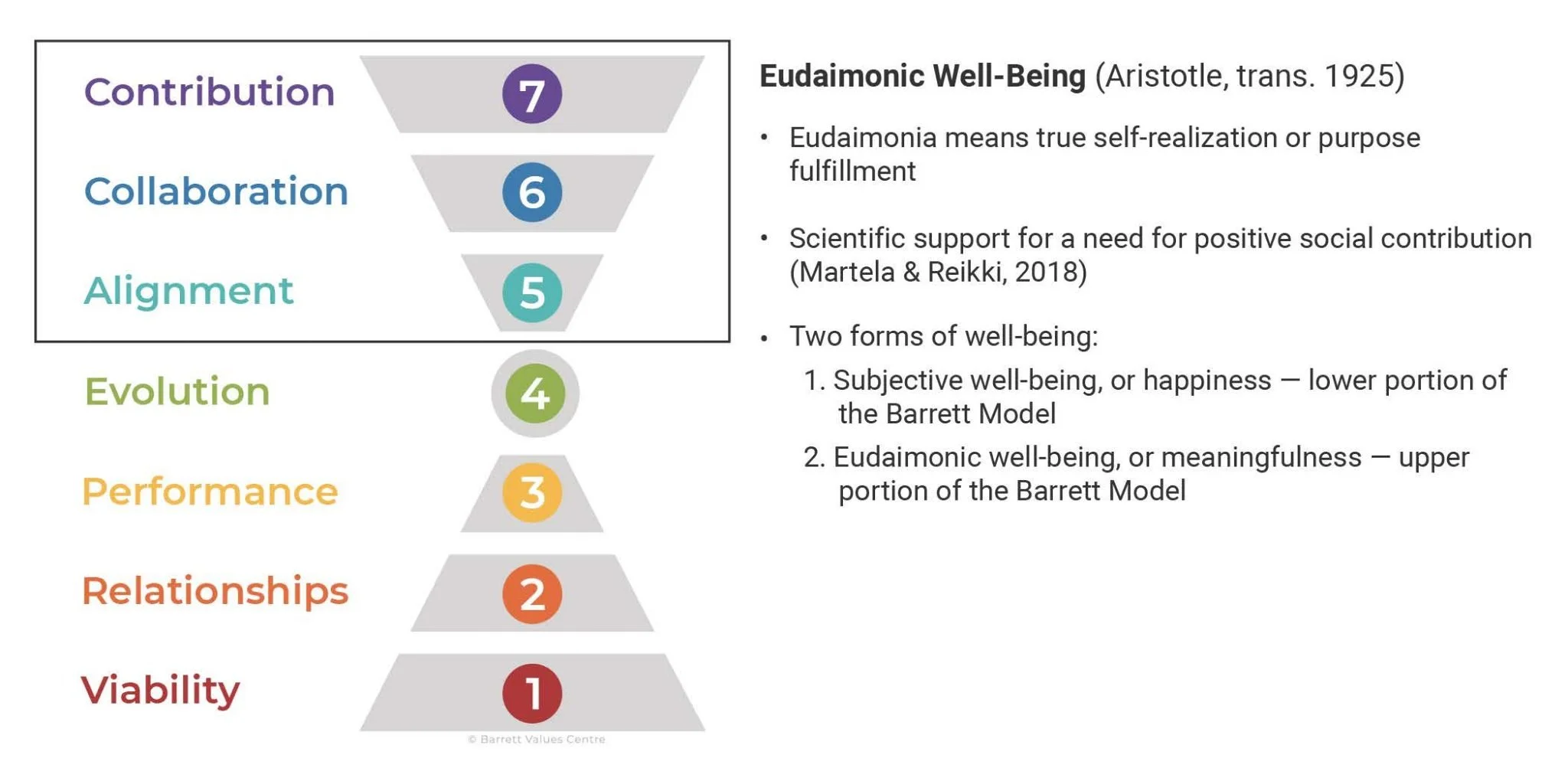 Research has shown eudaimonic well-being to be related to higher long-term physical and psychological health. Eudaimonia is actually very similar to Maslow’s concept of self-actualization and relates to the upper portion of the Barrett Model, namely the Alignment, Collaboration and Contribution levels. The full spectrum of the Barrett Model represents both the subjective, hedonic well-being, arising from satisfying the foundational needs, and eudaimonic well-being, arising from the satisfaction of the higher needs of the model.