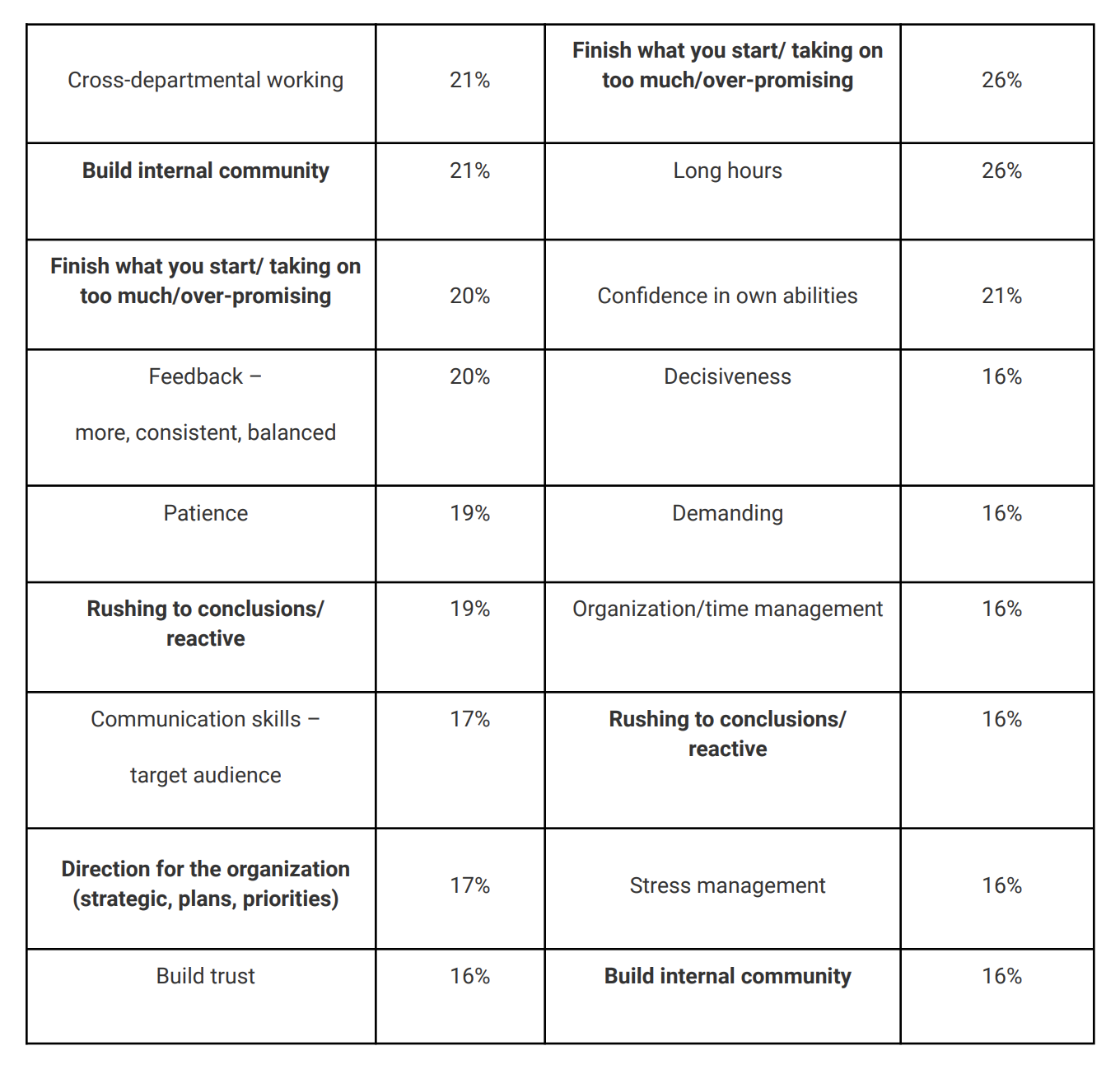 Female leaders also are seen to over-extend and be too hard on themselves and others, with emphasis on long hours, demanding, organization/time management, and stress management. And, despite their strengths and top values which point to promoting a collaborative working style, female leaders are not adequately handing things over to relieve some of this burden, as they are more likely than men to need to work on delegating and empowering. These areas for improvement may be tied to the drive among female leaders to get things done, as mentioned in the strengths. Female leaders, still in the minority, may feel a stronger need to prove themselves.