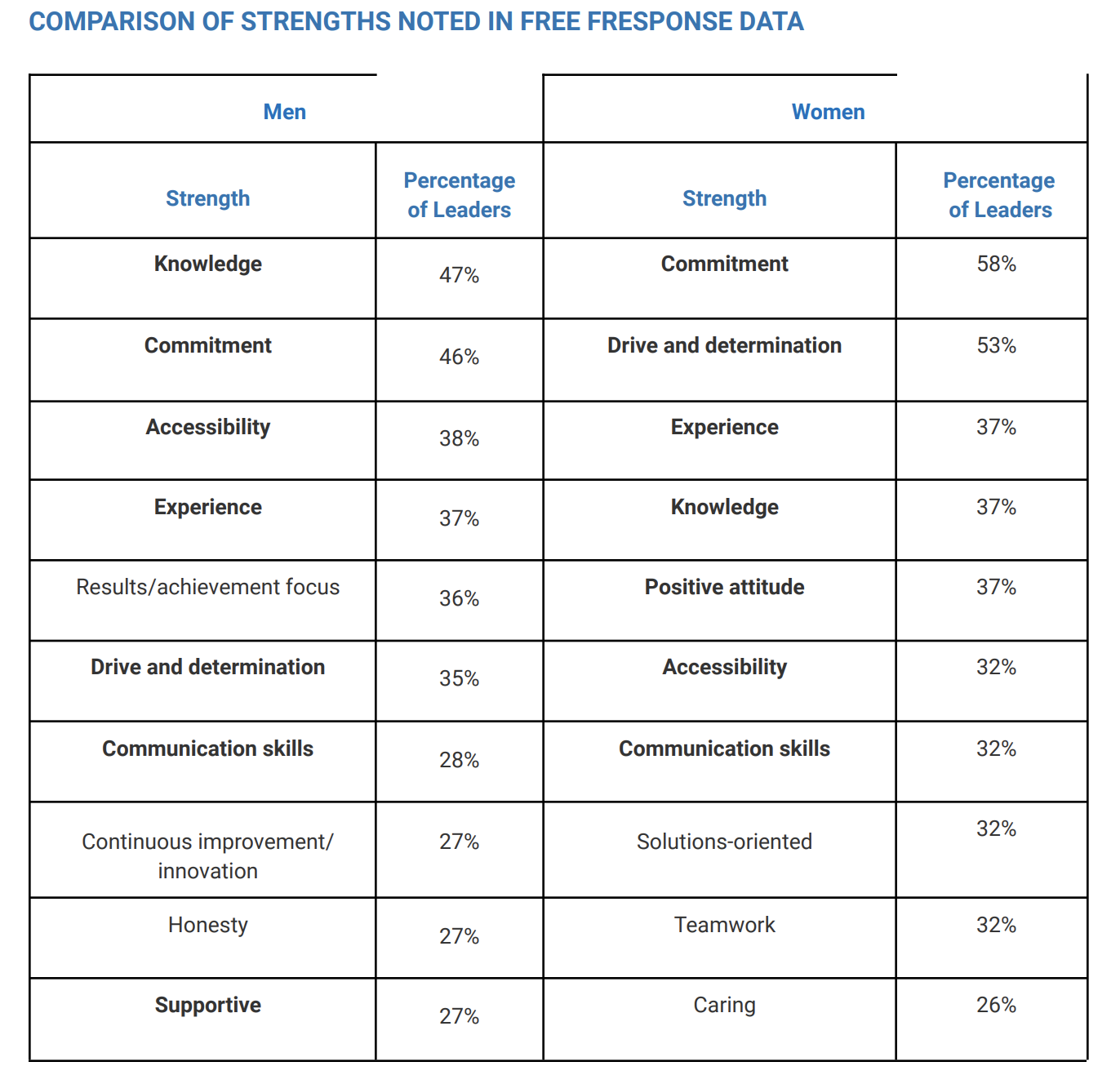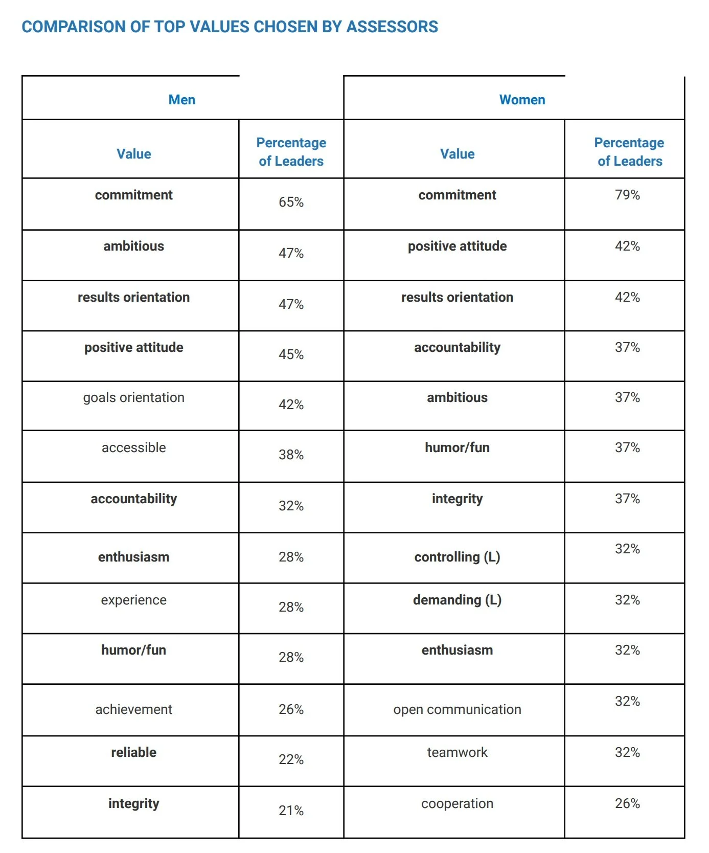 At the end of this article, there are three tables that show the top values, top strengths, and top areas of improvement as chosen by assessors for each gender.