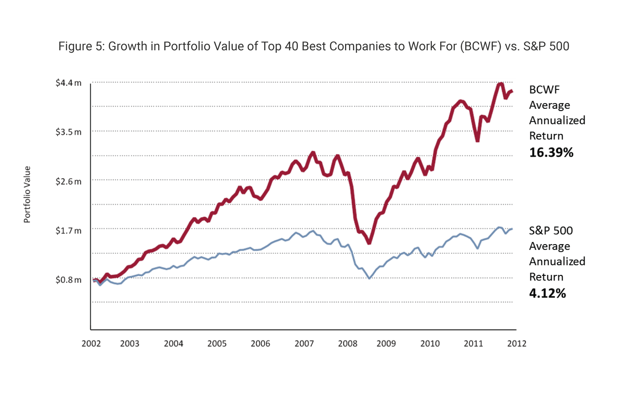 When employees feel engaged or highly engaged, revenues increase and the portfolio value of the organisation increases. The following graph shows how the portfolio value of the 40 of the best companies to work for in the USA outperformed the S&P 500 during the period 2002 to 2012.