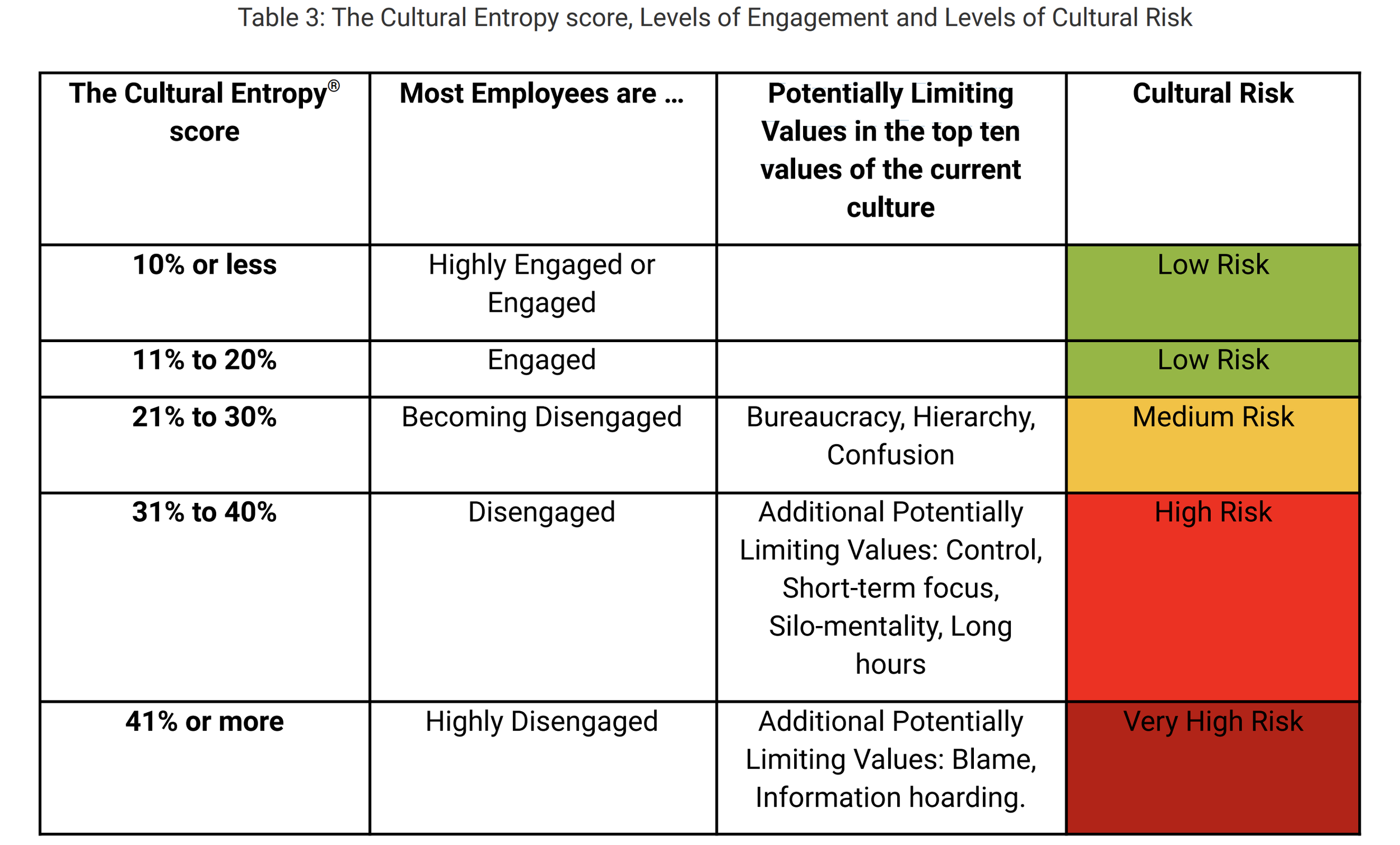 Culture is being increasingly recognised as a significant risk factor in business. Without a strong set of values, ethical and integrity-based risk can spiral out of control especially if the level of the Cultural Entropy score in an organisation grows beyond 20-30%. At this level of entropy, performance begins to stagnate, and the pressures to hold integrity ransom to profits are high. This factor alone has caused many companies to go bankrupt in recent years. Table 3 shows the potentially limiting values that correspond to different levels of entropy and the corresponding levels of cultural risk.