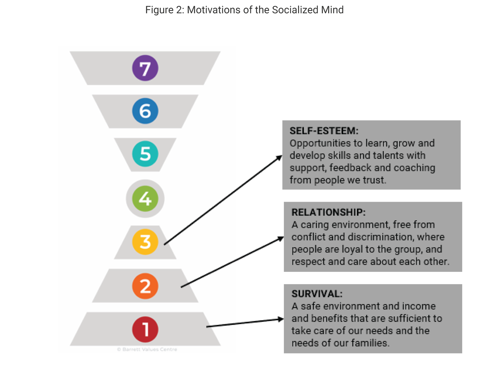The socialized mind is a dependent mind. The way a socialized mind responds to a situation or a request is strongly influenced by what it believes others want to hear. It wants to fit in—stay in alignment with the group it belongs to—and has a limited ability for independent thinking. It is almost wholly focused on meeting its survival, relationship, and self-esteem needs. Those who operate with a socialized mind are unlikely to want to take on a leadership position. This could destabilize their carefully managed relationships to the group they belong to. Figure 2 shows what motivates people who operate with a socialized mind.